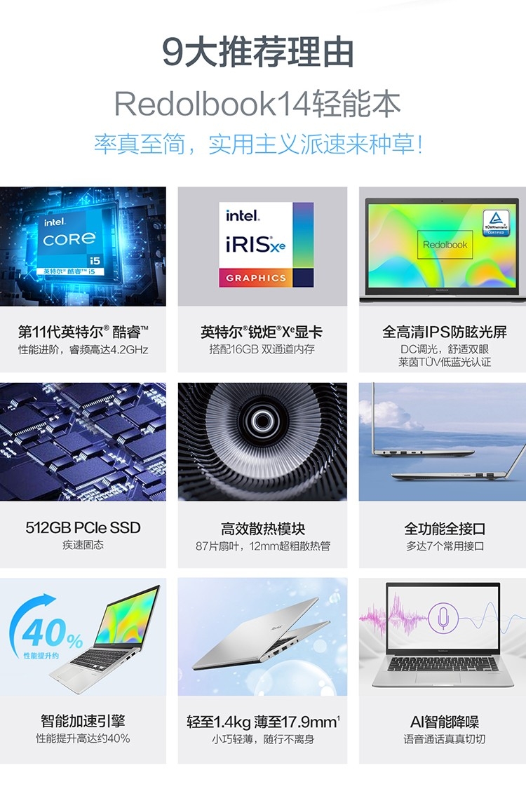 华硕Redolbook14 英特尔酷睿i5 学生网课办公商务高性能轻薄笔记本电脑(i5-1135G7 16G 512G 锐炬显卡)高闪银
