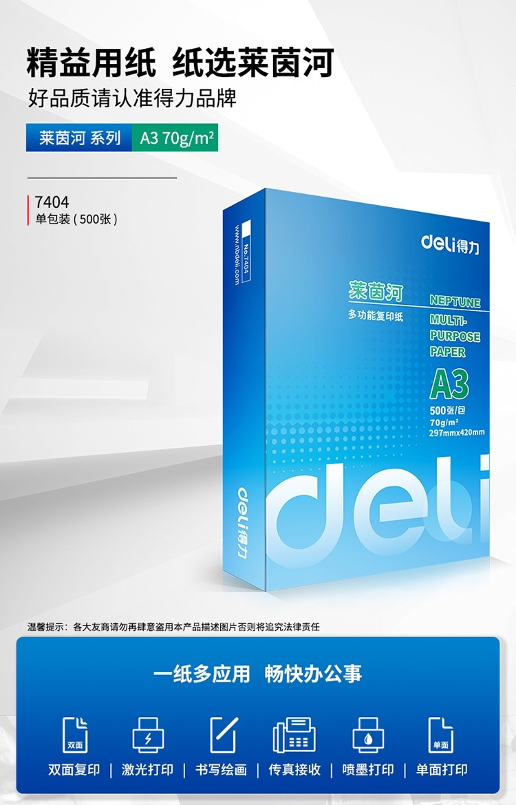 • 商品名称:得力(deli)莱茵河 70g A3 复印纸 中高档打印纸 500张1包 单包装
